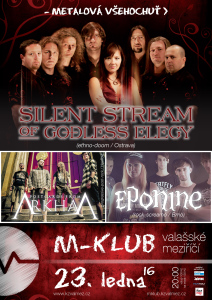 Metalové večírky se již za svou dobu staly v M-klubu téměř tradicí a každý měsíc představují ty nejlepší tuzemské i zahraniční kapely tohoto žánru. Ne jinak tomu bude i v roce 2016. Hned úvodního koncertu se ve sklepení zhostí hranická parta a tuzemská stálice Silent Stream of Godless Elegy. Na jaře loňského roku došlo na několik změn v obsazení , což se ale v žádném případě neodráží v jejich folklorem okořeněném metalu. Návštěvníci koncertu se mohou těšit na prověřené pecky typu I Would Dance, Dva Stíny Mám či působivou skladbu Pramen, co ví i nové skladby z připravovaného alba.