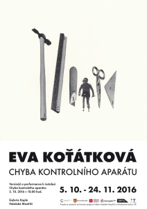 Galerie Kaple představuje rozměrnou prostorovou instalaci nejúspěšnější české umělkyně, Evy Koťátkové, která zatím v Česku nebyla prezentována. Ve středu 5. října v 18.00 hodin se na vernisáži uskuteční také performance o čtyřech hercích, nesoucí totožný název „Chyba kontrolního aparátu“, jako samotná instalace vytvořená v tomto roce. Výstava držitelky Ceny Jindřicha Chalupeckého a výtvarnice, která v minulém roku uskutečnila více než desítku zahraničních instalací, potrvá do 24. listopadu 2016.